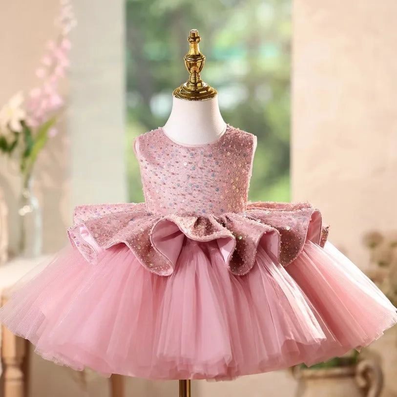 A dreamy pastel-pink party frock with a sparkly sequin bodice, a statement ruffled peplum waist, and a soft, full tulle tutu skirt for extra twirl. Finished with a sweet matching bow headband look—perfect for birthdays, photos, and special moments.