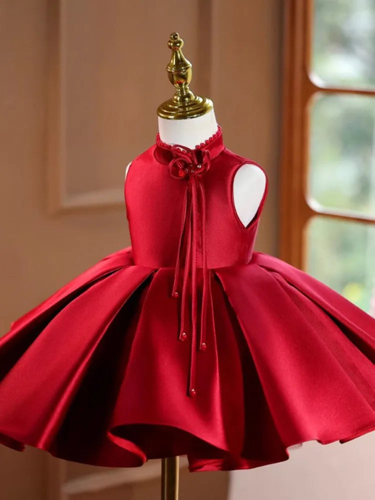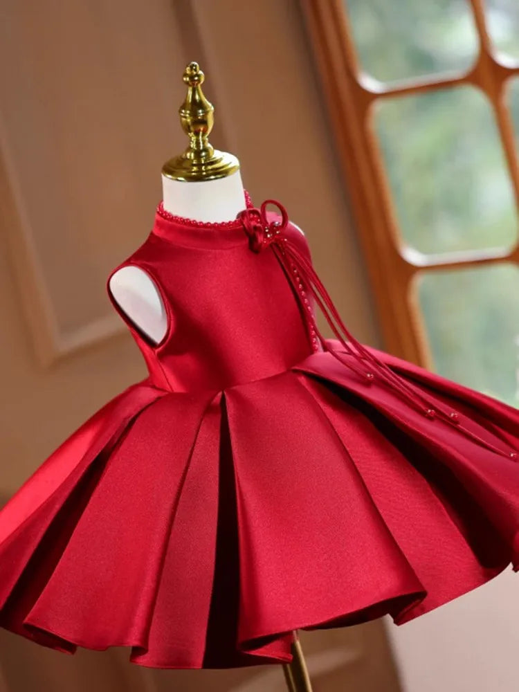 A sleek sleeveless red dress with a chic high collar and elegant knot tassel detail. The structured pleated skirt flares wide for a bold, festive twirl—simple, classy, and celebration-ready.